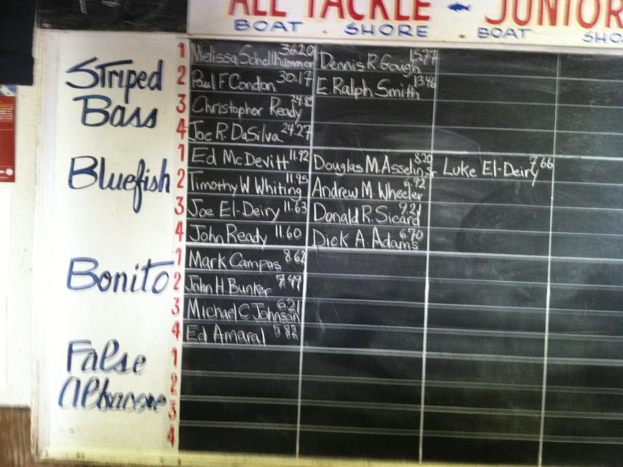 It is day 21 of the Martha's Vineyard Striped Bass Fishing Derby. I can report that family members have "made the board," placed in the "dailies" and will, with confidence, continue to until the last day of fishing - October 15.